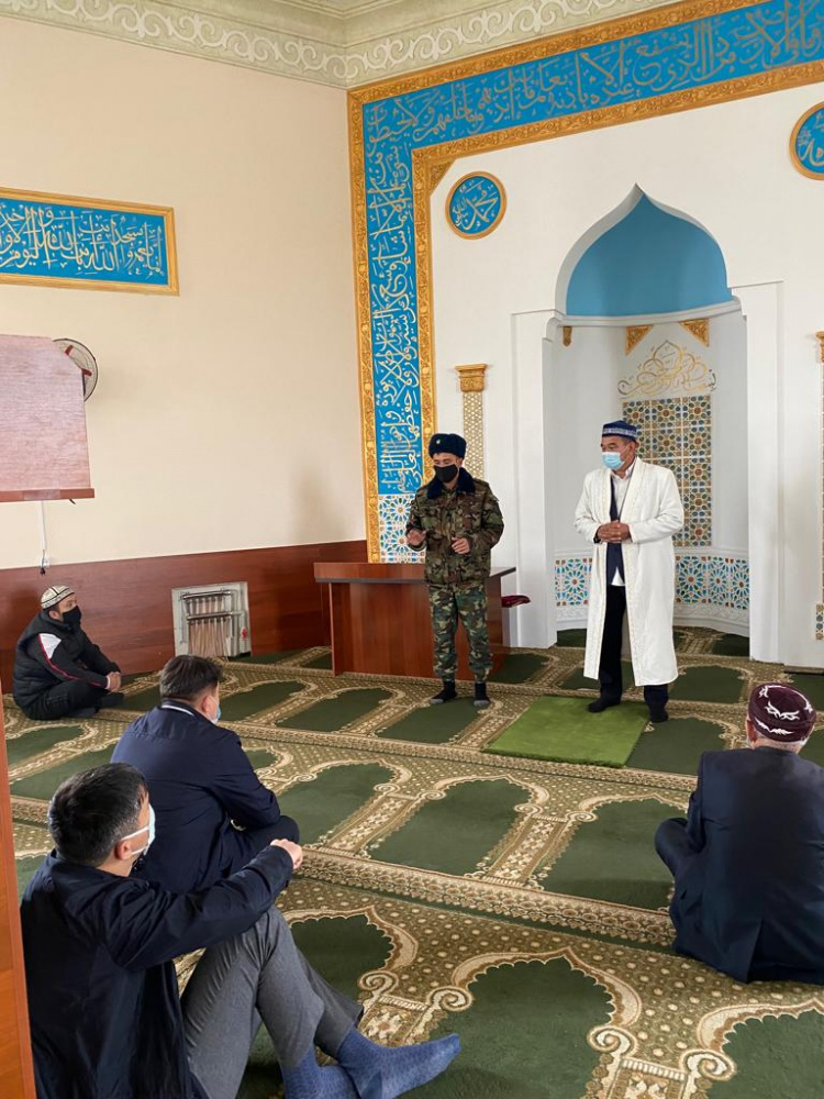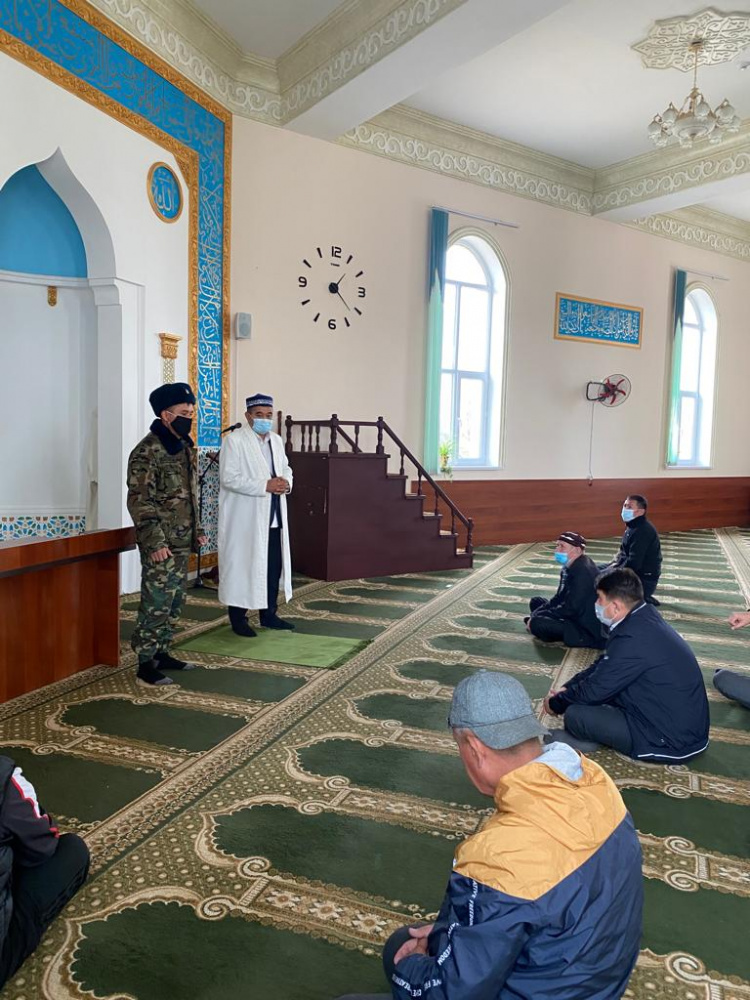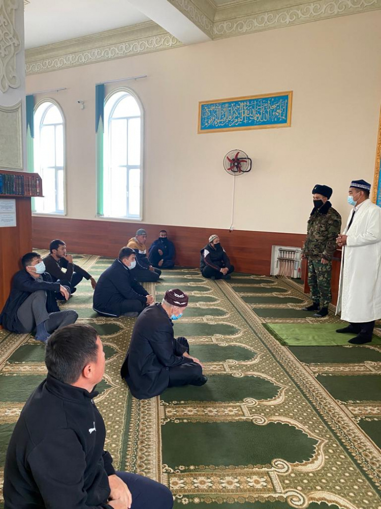 ҚМДБ-ның Жамбыл облысы бойынша бас имамы Бейбіт Мырзагелдиевтің тапсырмасына сәйкес, Жамбыл ауданы орталық «Бәйдібек» мешітінің бас имамы Ғайырфулла Қуанышбекұлының ұйымдастыруымен мешіт жамағаттары мен ауыл имамдарына өрт қауіпсіздігін түсіндіру жұмыстары жүргізілді.