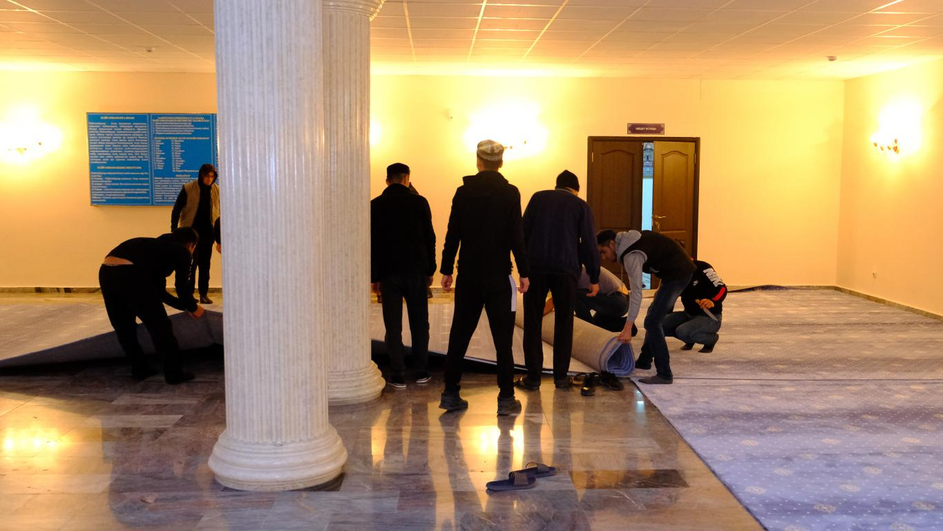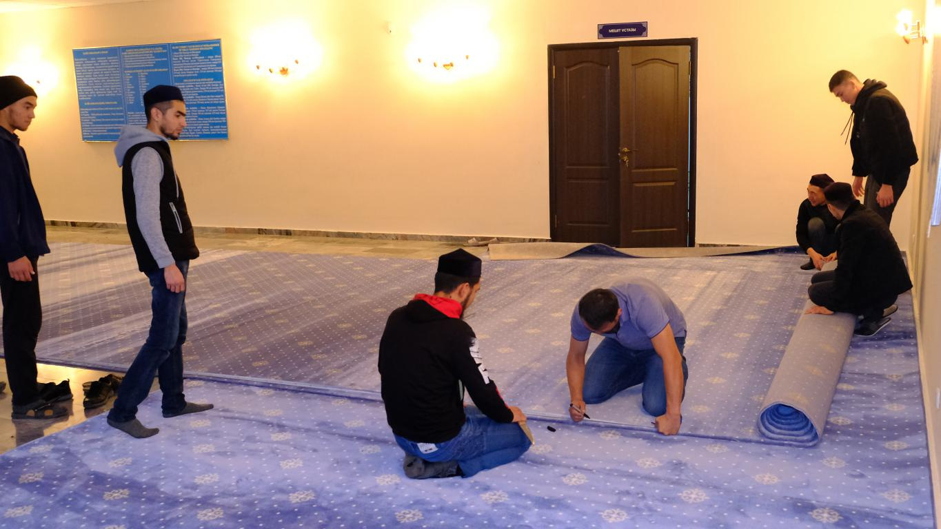 Арнайы тапсырыспен алдырылған кілемді мамандар келіп төсеп, ғимарат көрікке бөленді.