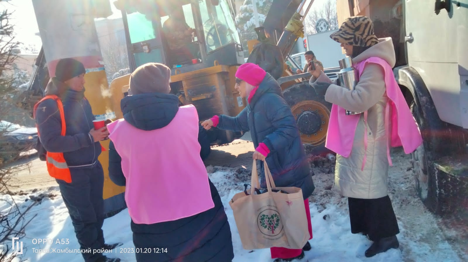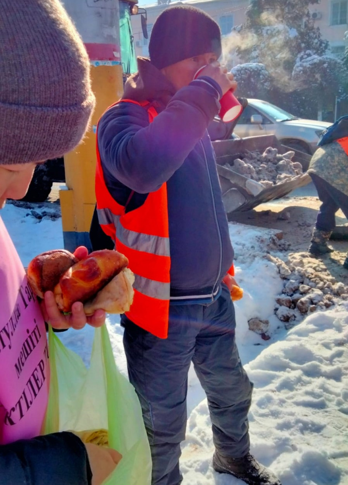 "Ізгілік науқаны" шарасы аясында шәкірттер суық күні көше тазалап, еңбек етіп жүрген қызметкерлерге ысық тағам мен ыстық шай ұсынды. Аязда ыстықтай тамақ ішіп, мешіттен жылулық көрген аға-әпкелер алғыстарын білдіріп, разылықтарын жеткізді.