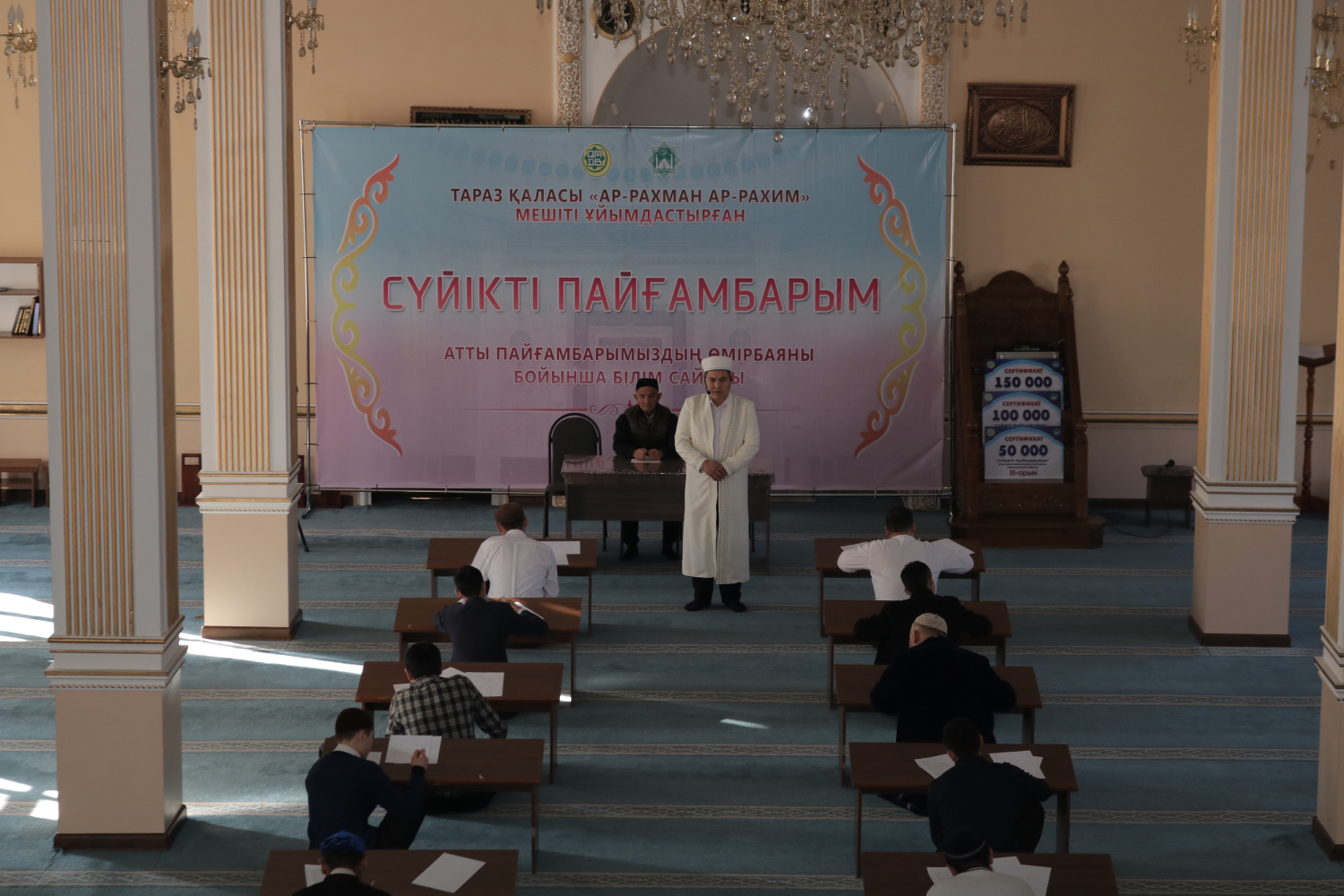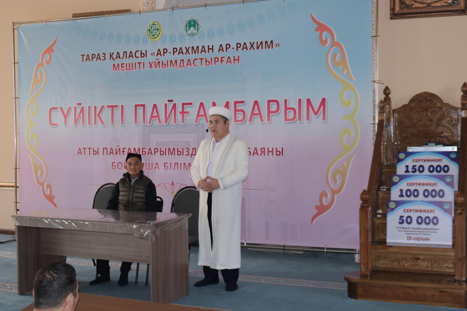 Тараз қаласына қарасты «Ар-Рахман Ар-Рахим» мешітінің имамы Ембергенов Амангелді Назарбайұлының ұйымдастыруымен «Сүйікті пайғамбарым» атты білім сайысы өтті. Жарыс Тараз қаласының медресе бітірмеген, Нұр-Мұбарак университетін оқымаған тұрғындарына арнап ұйымдастырылды. Іс-шара қасиетті Құран Кәрімнің Алла елшісіне (оған Алланың салауаты мен сәлемі болсын) қатысты аяттарын оқумен басталды. Өз кезегінде имам Пайғамбарға (оған Алланың салауаты мен сәлемі болсын) деген сүйіспеншілік жайлы уағыз айтты.