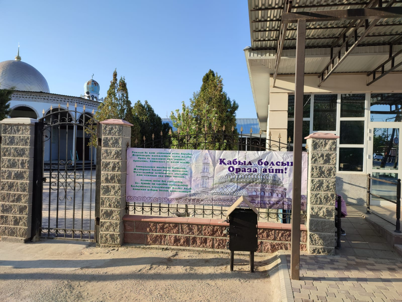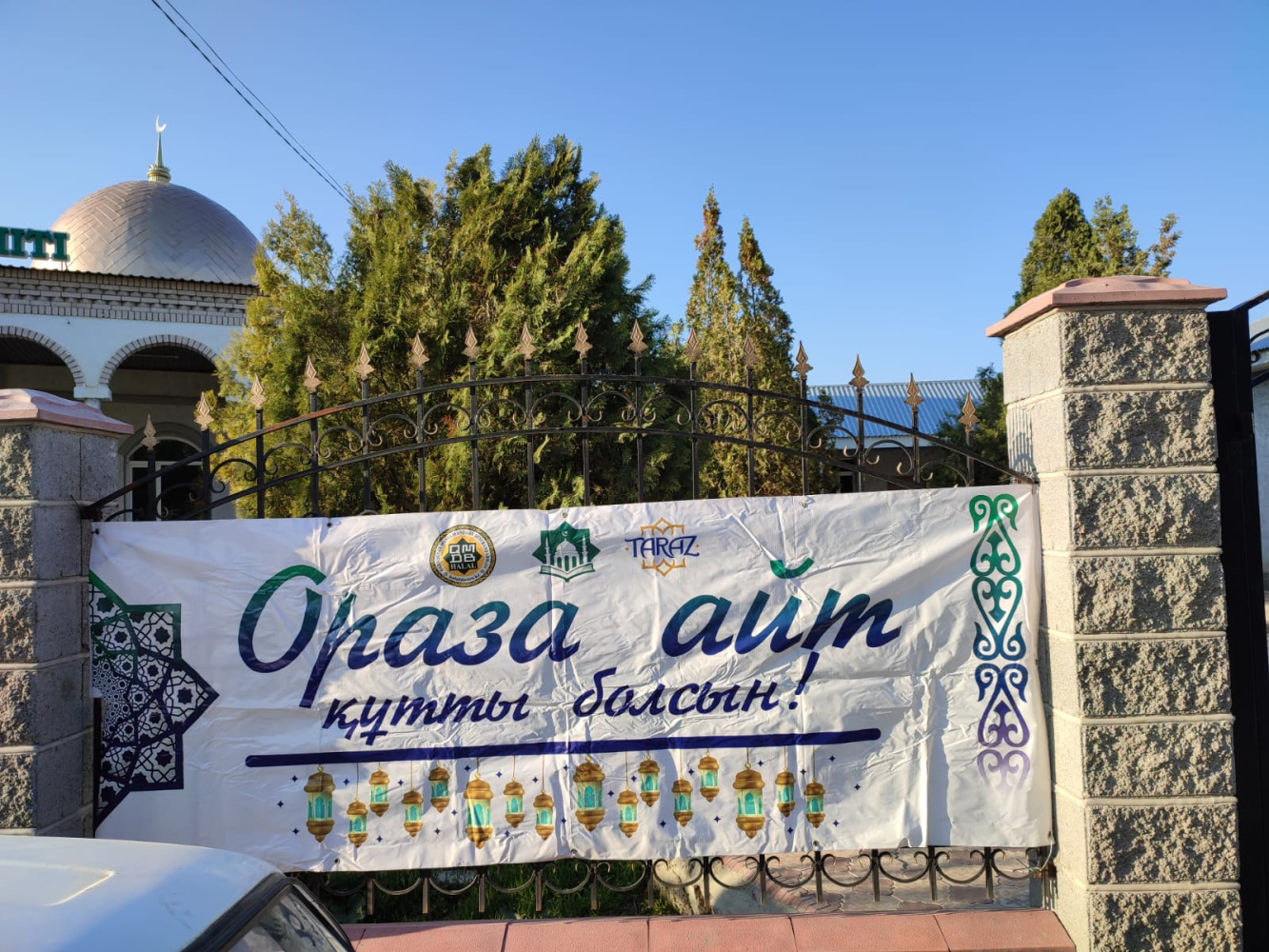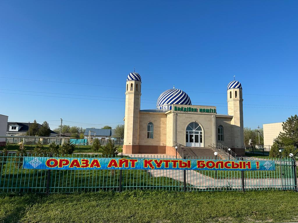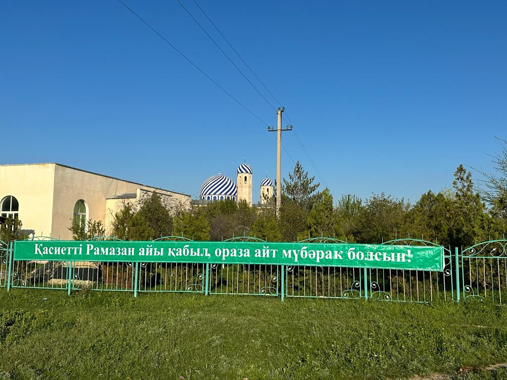 Жамбыл ауданында ауданға қарасты мешіттерде қасиетті Ораза айт мейрамына орай баннерлер үлінуде.