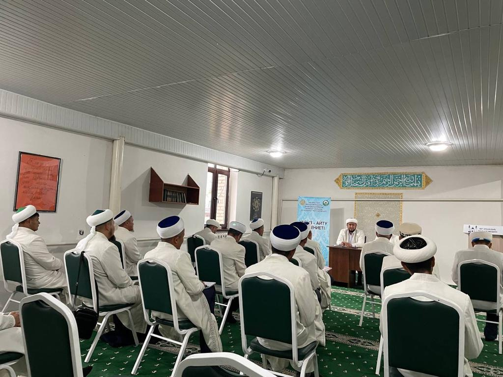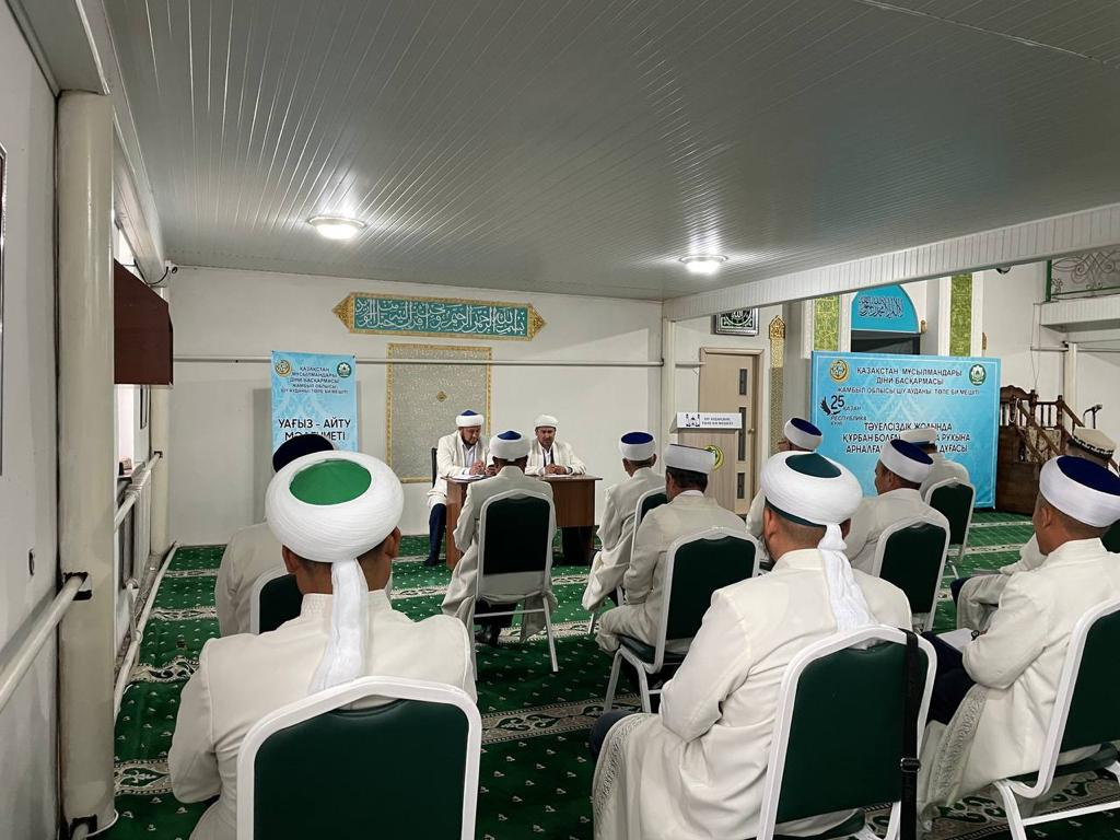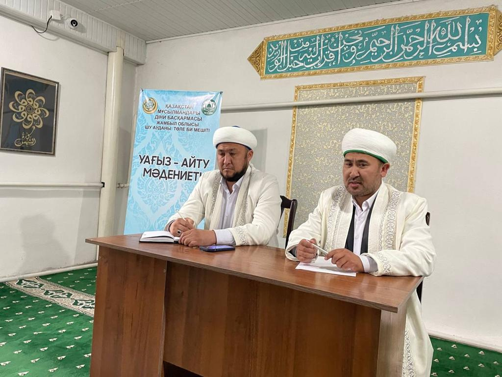 Шу ауданы "Төле би" мешітінде өңір имамдарының кезекті жиыны өтті. Шарада бас имам Алмас Кенжемолдаев пен аталған мешіттің имамы Талғат Кәрібайұлы "Уағыз айтудың әдебі" турасында сөз қозғады.