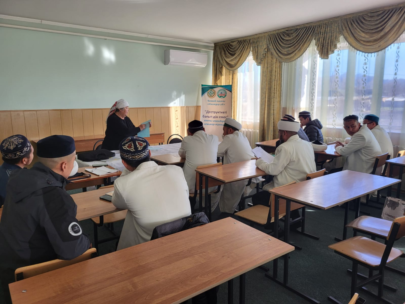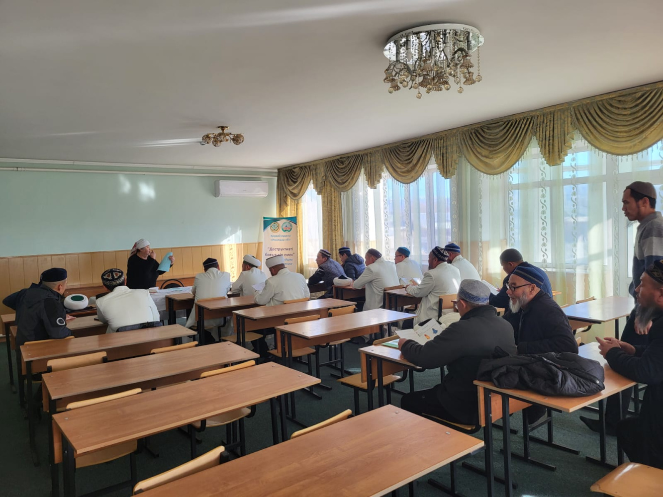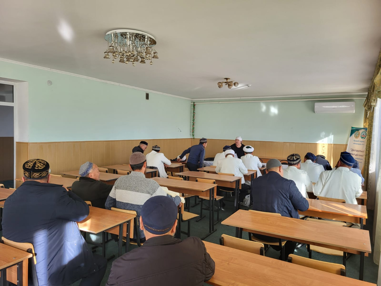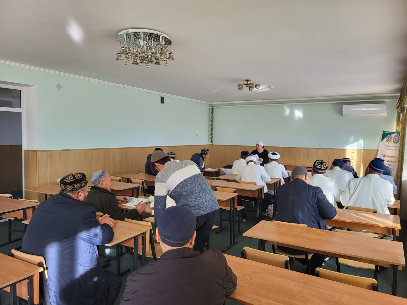 Қазақ тілін үйрету үшін арнайы тағайындалған «Қордай аудандық тіл орталығының» маманы Анара Мұқашқызы өзге ұлтты имамдарға ана тіліміздің грамматикалық ережелерімен қоса күнделікті қолданыстағы мәміле сөздерін тәжірибе түрінде көрсетуде.