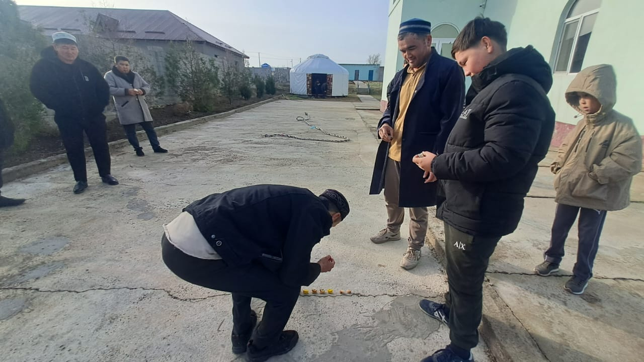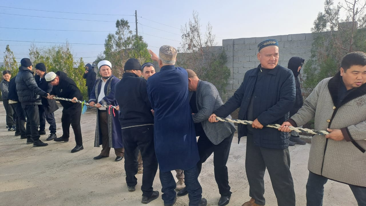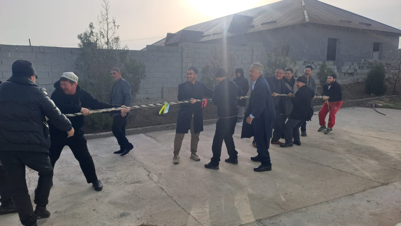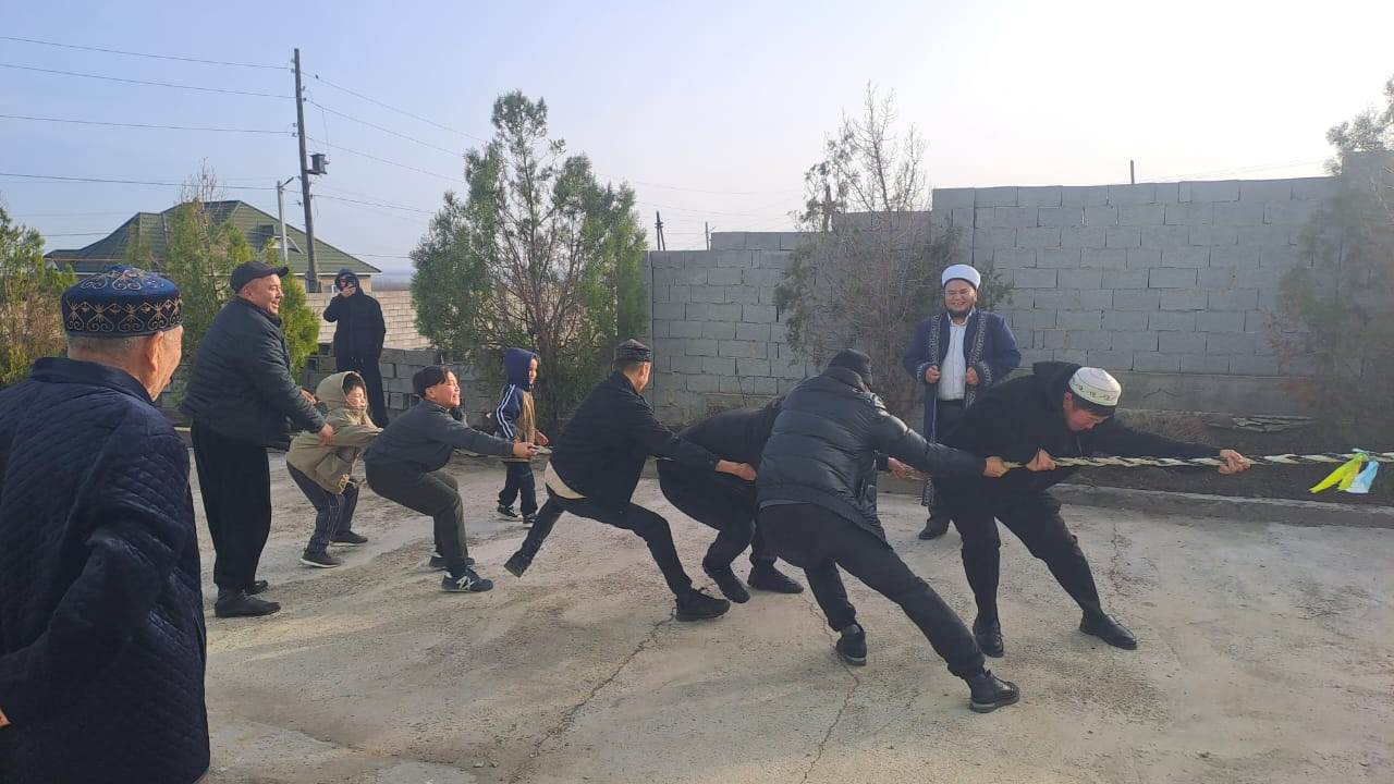 Намаздан кейін қазақтың дәстүрін ұлықтау мақсатында он екі қанатты күйіз үйге кіріп, жамағатпен дәм татып, аулада өткен асық ату және арқан тарту ойындарын тамашалады.