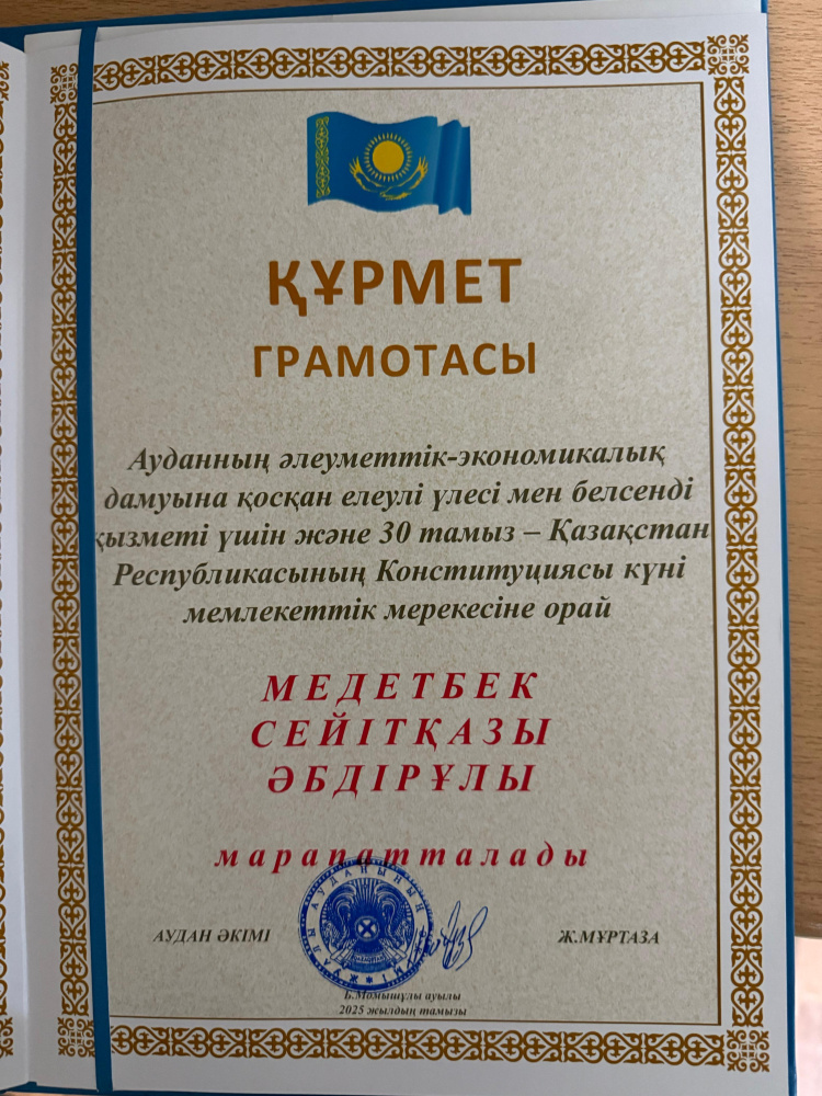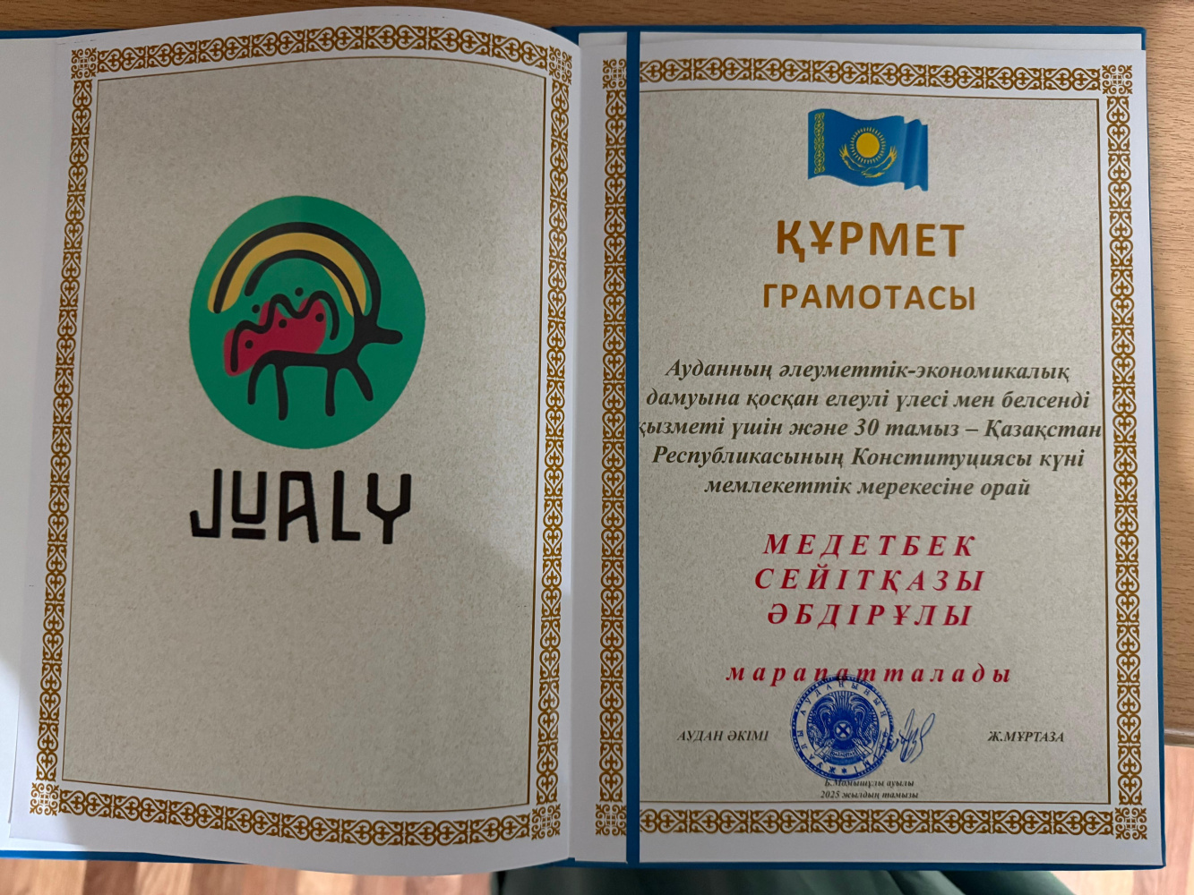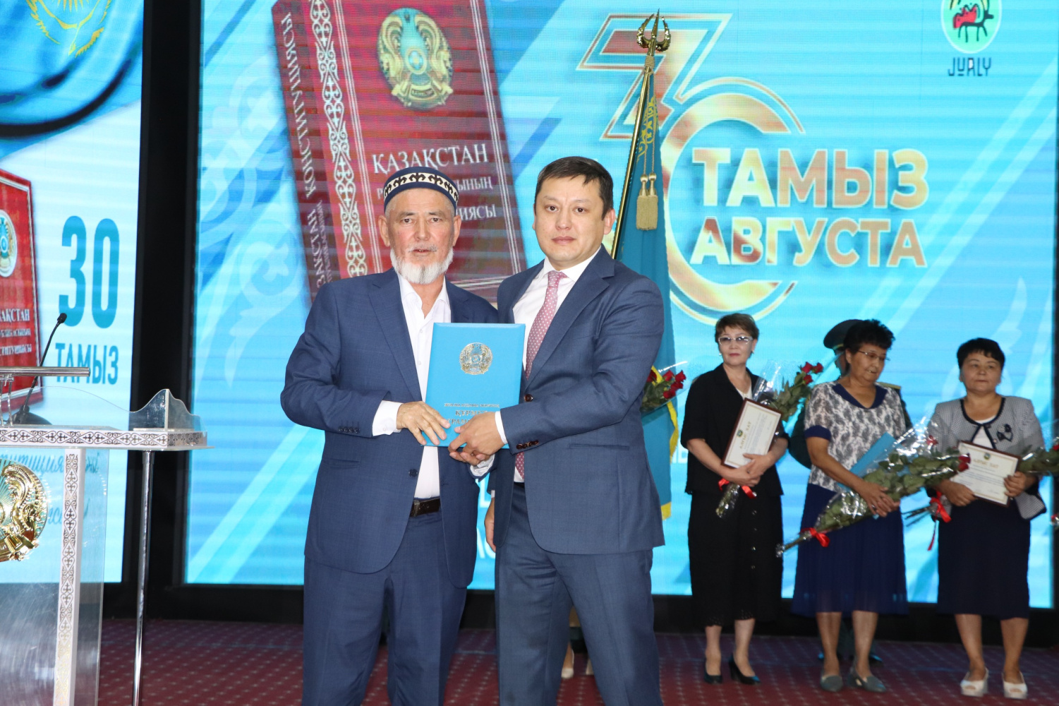 Конституцияның 30 жылдығына орай өңірдің дамуына үлес қосқан бірқатар азаматтар марапатталды. Жиында Жуалы ауданының құрметті азаматы, «Жуалы» мешітінің имамы Медетбеков Сейітқазы қажы Әбдірұлы арнайы Құрмет грамотасымен марапатталды. Жиын соңы көрермен жүрегіне отансүйгіштік сезім ұялатқан мазмұнды концерттік бағдарламаға ұласты.