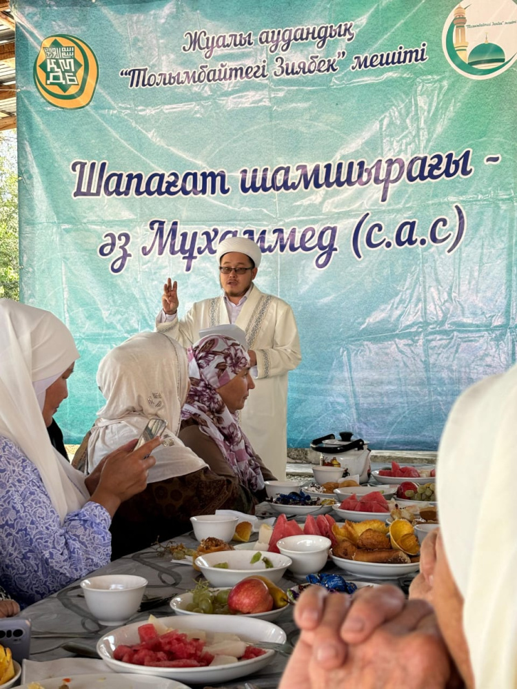 Мәуліт аасында Жуалы ауданының бас имамы: Таласбаев Есет Тұрдыбайұлы Пайғамбарымыз (с.а.у.) Отбасындағы қарым қатынасы және отбасы құндылықтары туралы айтып кеңінен түсіндіріп өтті. Пайғамбарымыз (с.а.у.) жайлы біраз уағыз-насихат жүргізді.