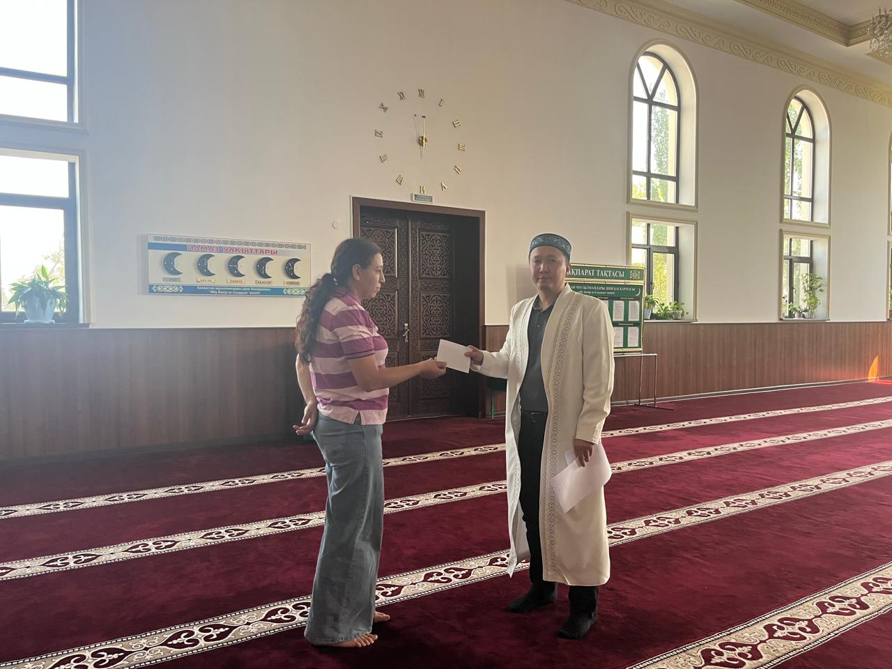 Тараз қаласы Әбу – Бәкір Ас – Сыдық мешітінде қайырымдылық шарасы өтті. Мұқтаж жандарға көмек көрсету мақсатында игілікті іс – шара ұйымдастырылды. Жақсылыққа жаны жақын жамағат пен демеушілердің атсалысуымен 10 отбасыға қаржылай көмек көрсетілді. Әр отбасыға 20 мың теңгеден беріліп, тұрмыс жағдайына аз да болса демеу болды.
