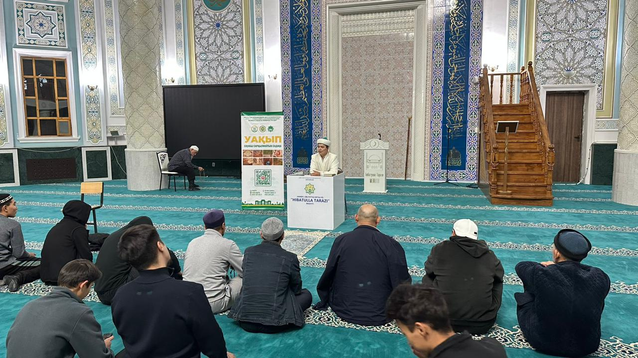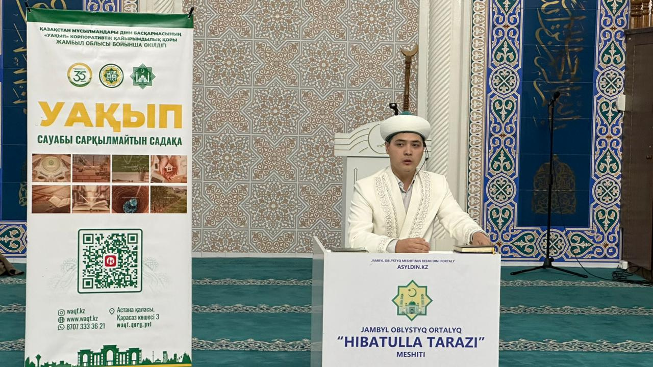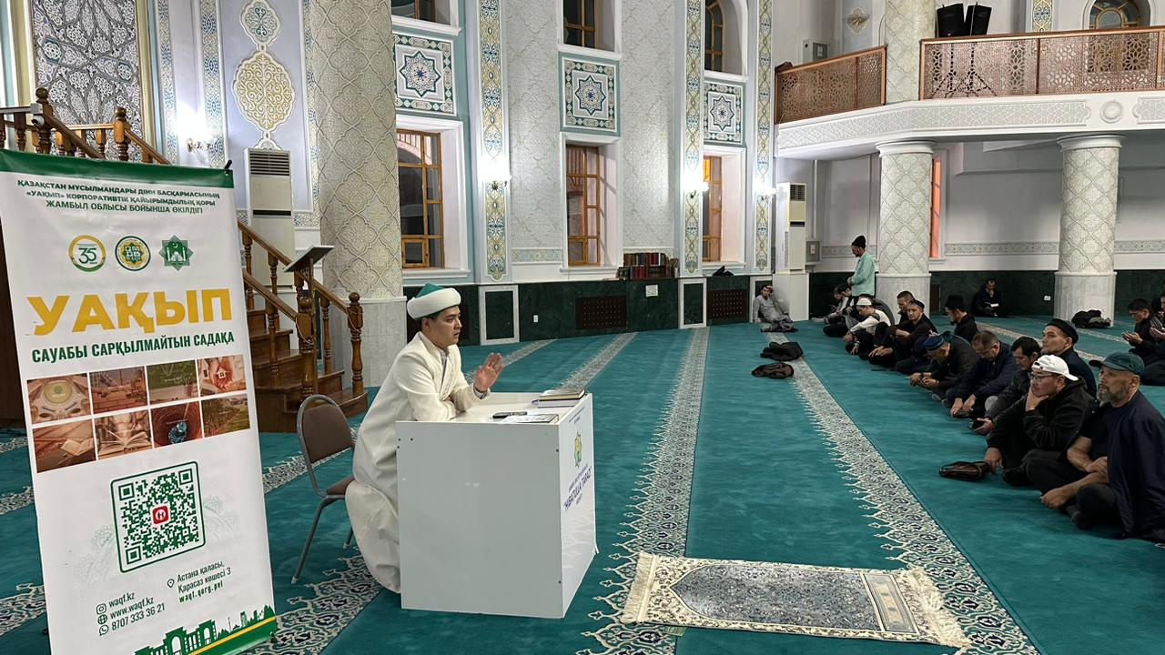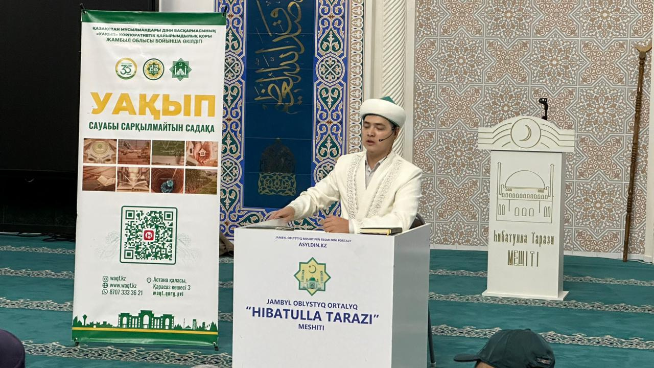 Жамбыл облыстық «Һибатулла Тарази» мешітінде уақып ісіне арналған түсіндіру және насихат жұмыстары өтті. Шара барысында уақып қорына жауапты өкіл, мешіттің азаншысы Амангелді Дәулет жамағатқа уақыптың мәні мен маңыздылығы туралы баяндама жасады.