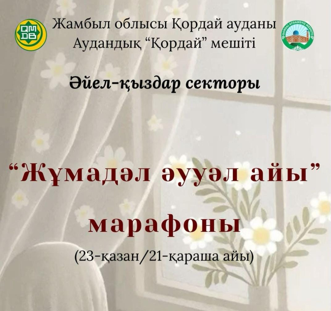 Жамбыл облысы, Қордай ауданы әйел-қыздар секторының жетекшісі Эльмира Аманқожақызының ұйымдастыруымен Рамазан айына дайындық ретінде «Жұмадал әууәл» марафоны бастау алды. Қыз-келіншектер арасында жүзеге асып жатқан бұл игі бастамада күн сайын түрлі рухани әрі ізгі істерге бағытталған тапсырмалар беріледі. Барша қатысушы нәзік жандылардың амалдары қабыл болып, ниеттері берік, имандары кемел болғай!