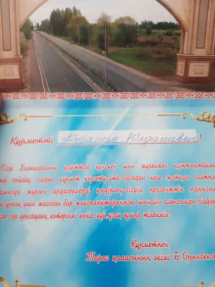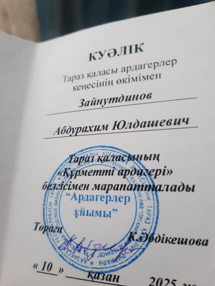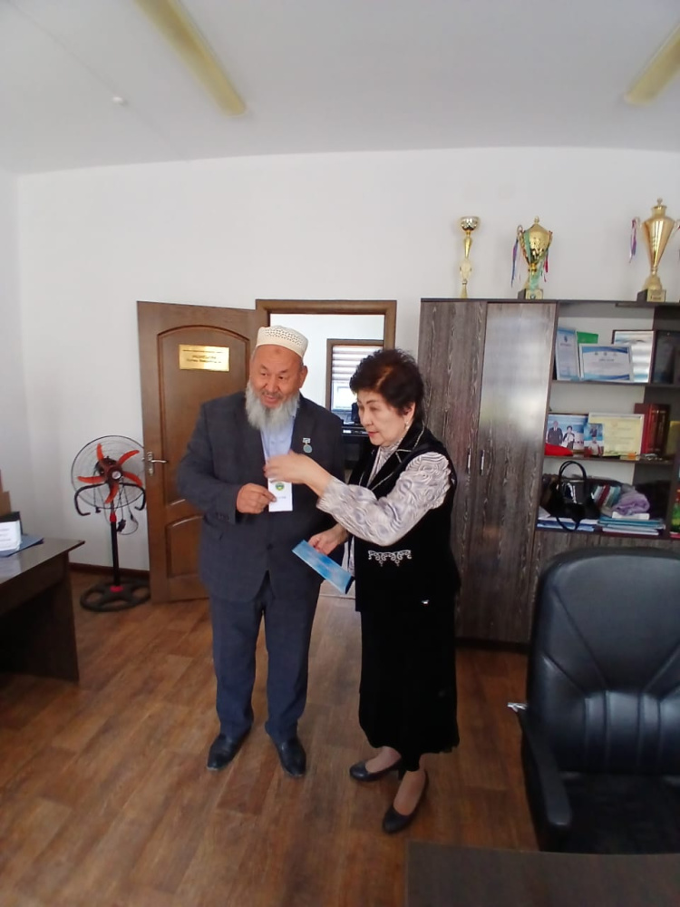 Тараз қаласында дін мен руханият саласында ұзақ жылдар бойы абыройлы еңбек етіп келе жатқан Мырқалық қажы мешітінің молдасы Зайнутдинов Абдурахим “Тараз қаласының Құрметті ардагері” төсбелгісімен марапатталды.