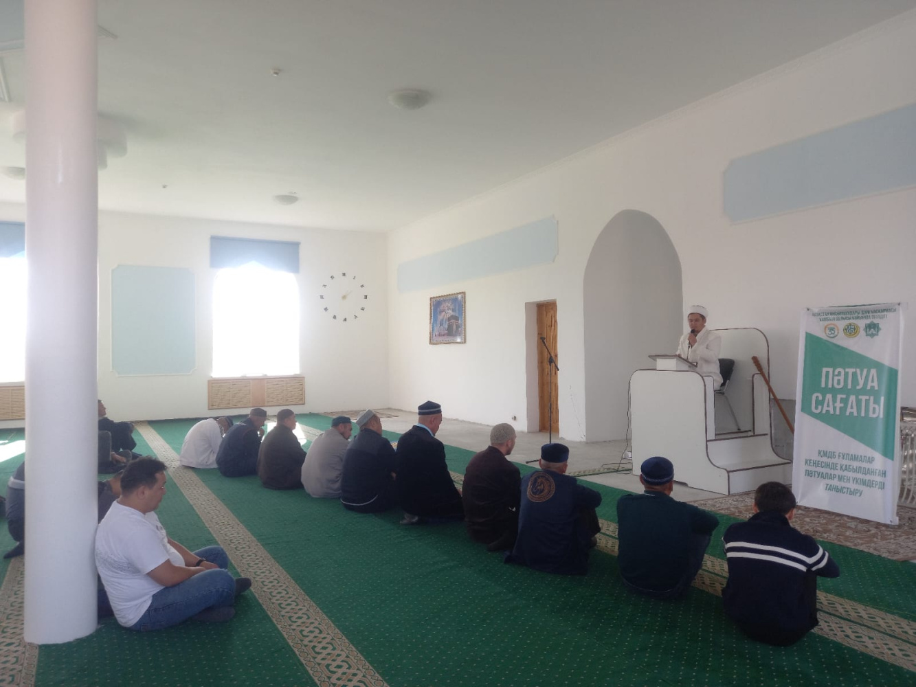 Мойынқұм аудандық "Мойынқұм" мешітінде рухани бағыттағы «Пәтуа сағаты» өтті. Кездесуді ауданның бас имамы Ержан Көшкімбаев жүргізіп, жамағатқа діни мәселелер төңірегінде тағылымды уағыз айтты.
