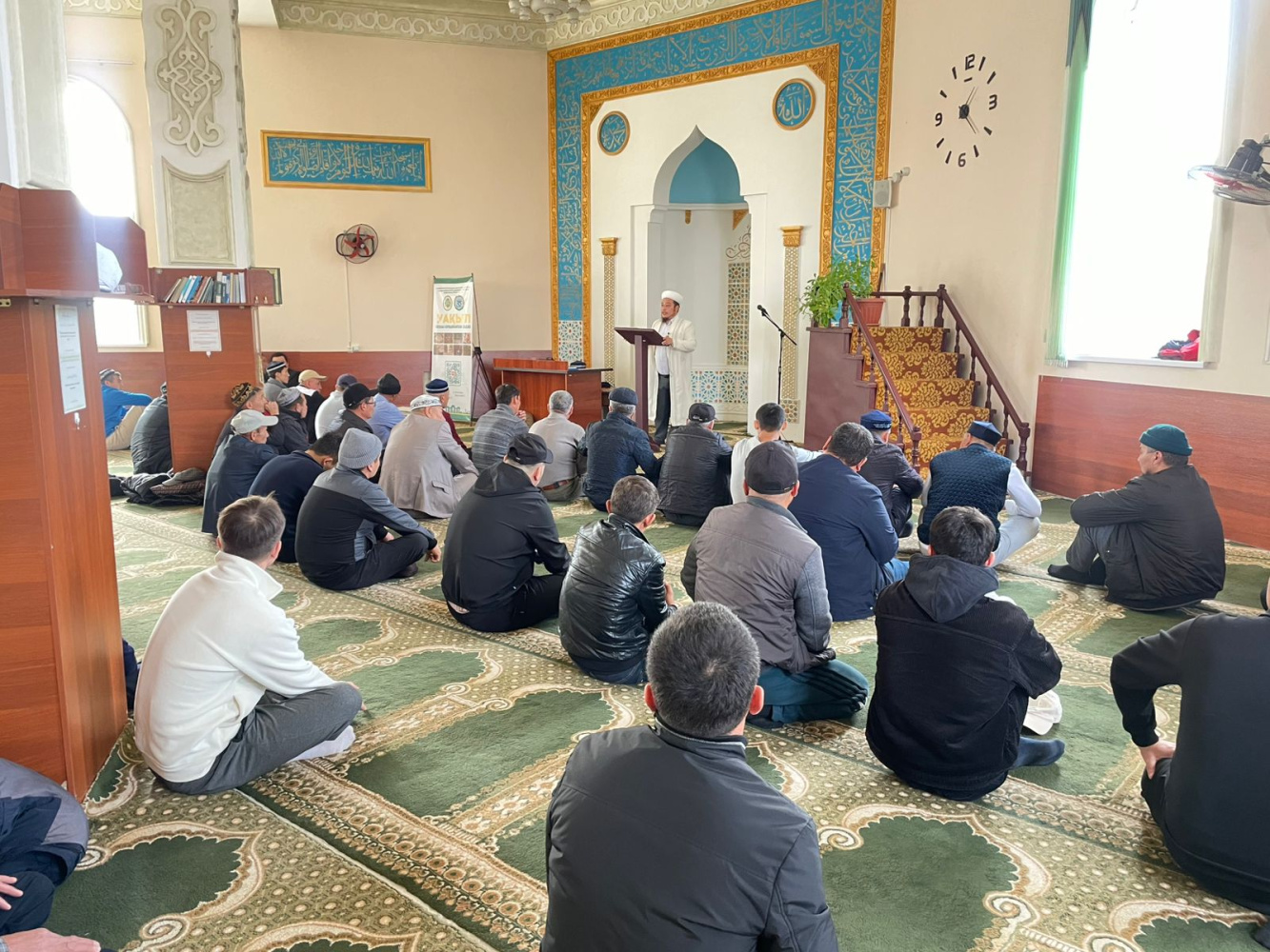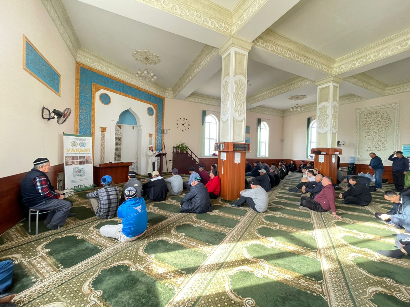 Жамбыл аудандық орталық "Бәйдібек" мешітінің бас имамы Даурен Куттыбаев мешітке жиналған жамағатқа "Уақып - қайырлы амал" тақырыбында үгіт-насихат жұмысын жүргізді.