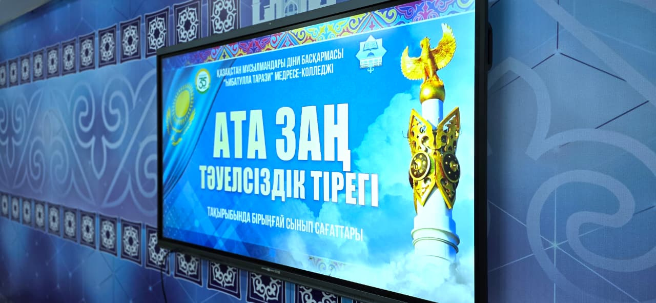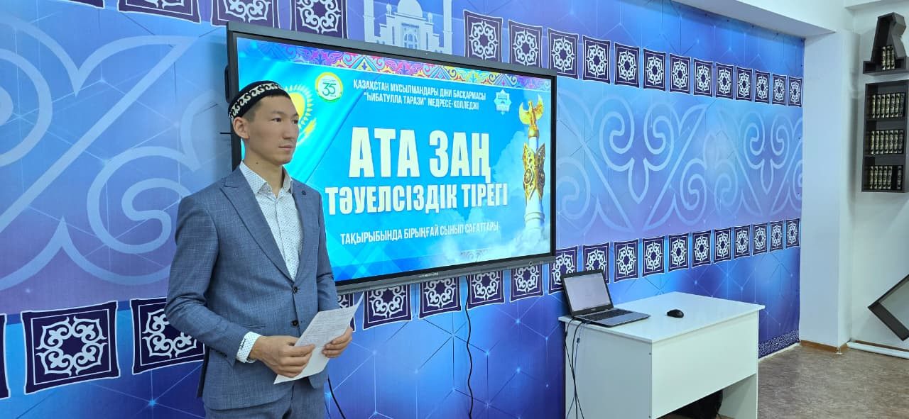 Арнайы сабаққа Қазақстан мұсылмандары діни басқармасының Жамбыл облысы бойынша бас имамы Асқар Зәкіржанұлы мен медресе-колледж директоры Жарбол Болатұлы қатысты. Бас имам өз сөзінде Тәуелсіздіктің қазақ халқы үшін баға жетпес құндылық екенін атап өтіп, егемен ел болудың жауапкершілігі мен оның бүгінгі ұрпаққа жүктеген аманатына тоқталды. Сондай-ақ тәуелсіздіктің діни еркіндік пен рухани жаңғыру жолындағы маңызы кеңінен сөз етілді.