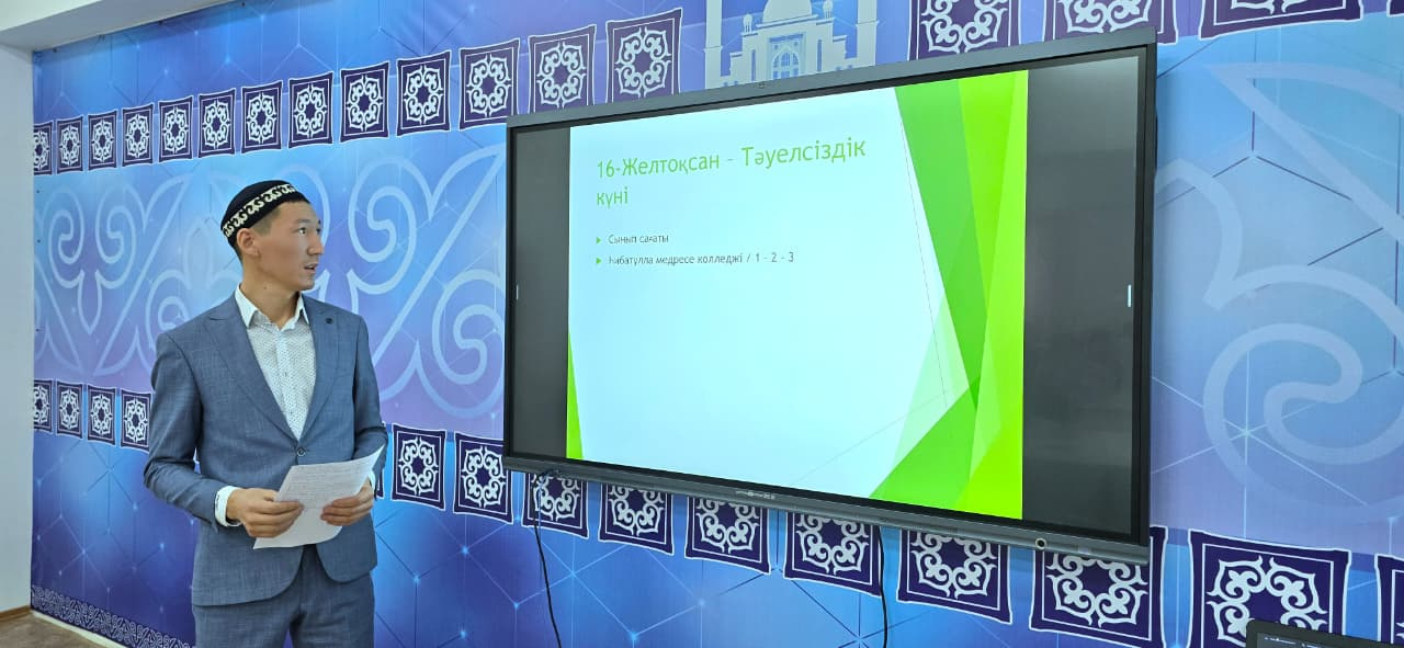 "Һибатулла Тарази" медресе-колледжінде 16 желтоқсан – Қазақстан Республикасының Тәуелсіздік күніне орай шәкірттермен ашық сабақ өткізілді. Шараға оқу орнының 1, 2, 3 курс студенттері қатысып, ел тарихындағы маңызды кезеңдер жөнінде мазмұнды дәріс тыңдады.