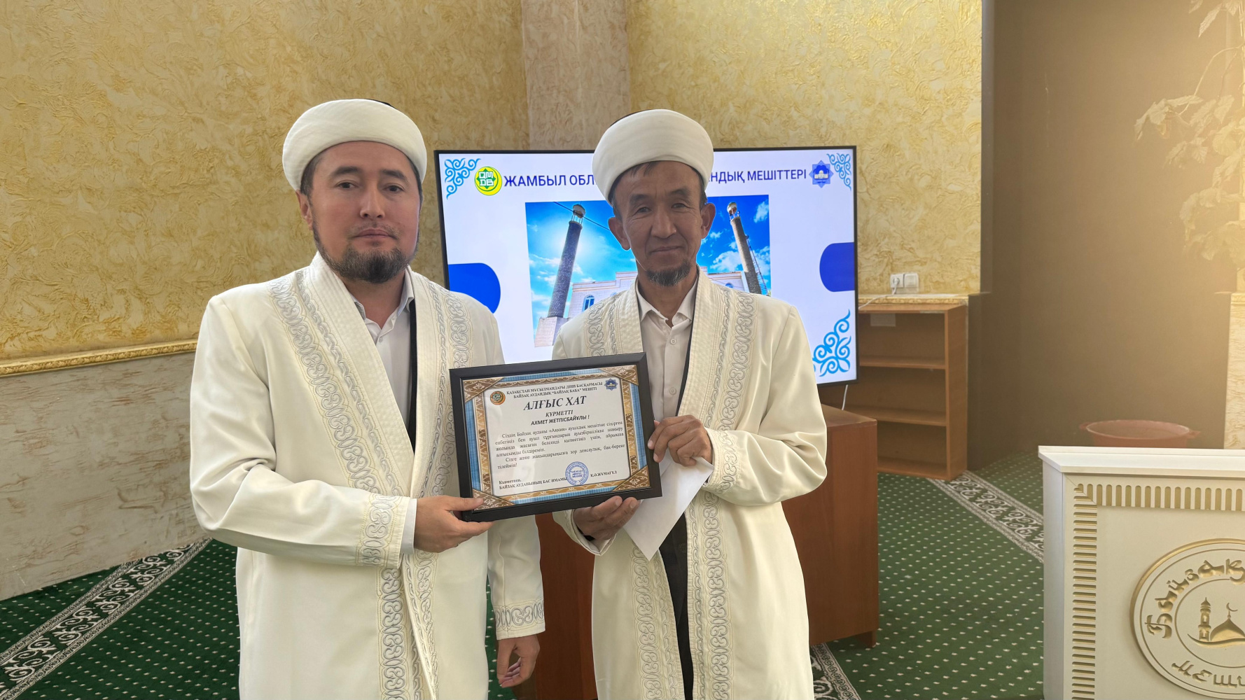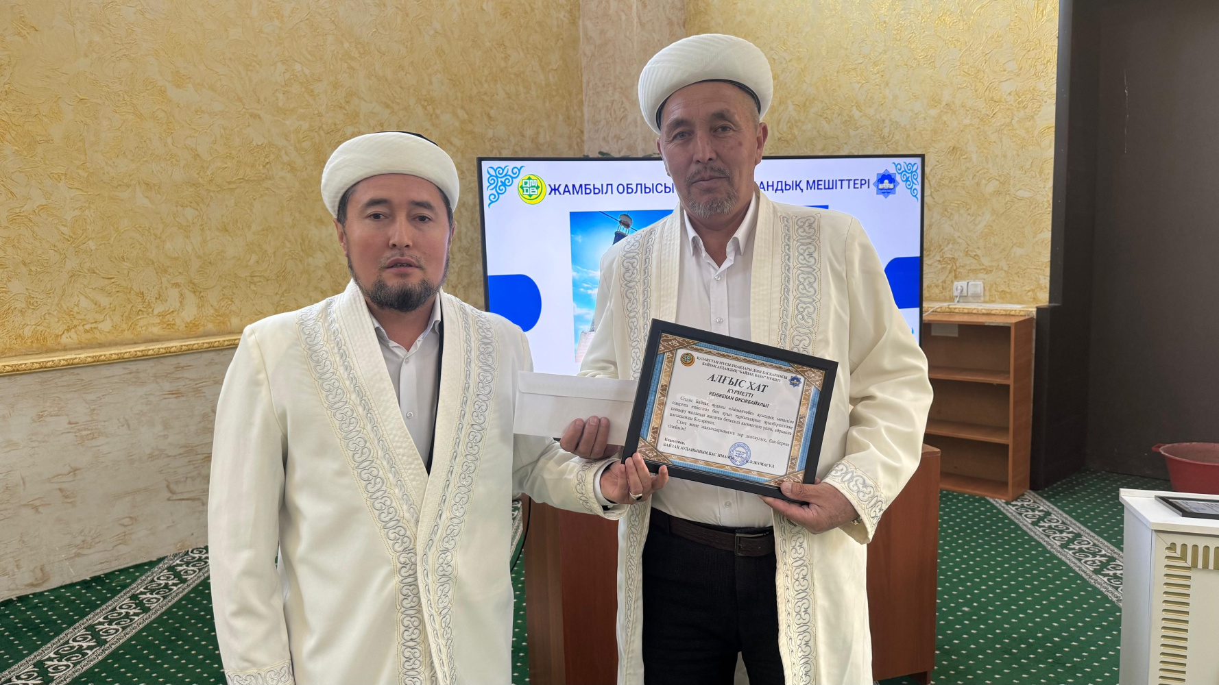 Алғыс хат мәтінінде: «Сіздің асыл дініміз бен рухани құндылықтарымызды насихаттау арқылы Байзақ ауданы Жалғызтөбе ауылдық округі Аққия ауылы «Аққия» мешітіне сіңірген ыждаһатты еңбегіңіз бен ауыл тұрғындарын ауызбіршілікке шақыру жолында жасаған белсенді қызметіңіз үшін, сізге айрықша алғысымды білдіремін.