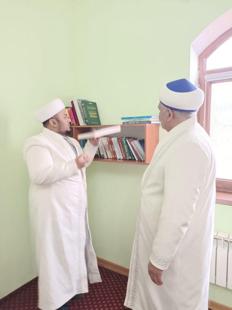 Мешіттің іші-сыртын толық аралап, дәретхана тазалығы, мешіт құжаттары, жамағатқа ұсынылған діни әдебиеттер, мешітте ілінген баннерлерге және бейне бақылау жүйесінеде шолу жасады. Аталған мешіттің имамымен дидарласып, жамағаттың хал-ахуалын сұрады. Алдағы жоспарлардың орындалуын тексеріп, бірқатар тапсырмаларды тапсырды.