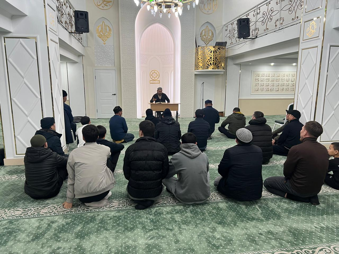 Аудандық орталық «Жәми» мешітінің наиб имамы Мағжан Рзахан «Төле би» мешітінде фиқһ ілімі бойынша тағылымды дәрістерін жүргізіп, жамағатқа шариғат негіздерін кеңінен түсіндіруде.