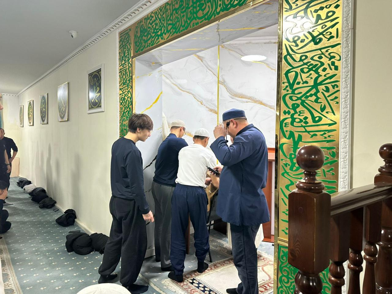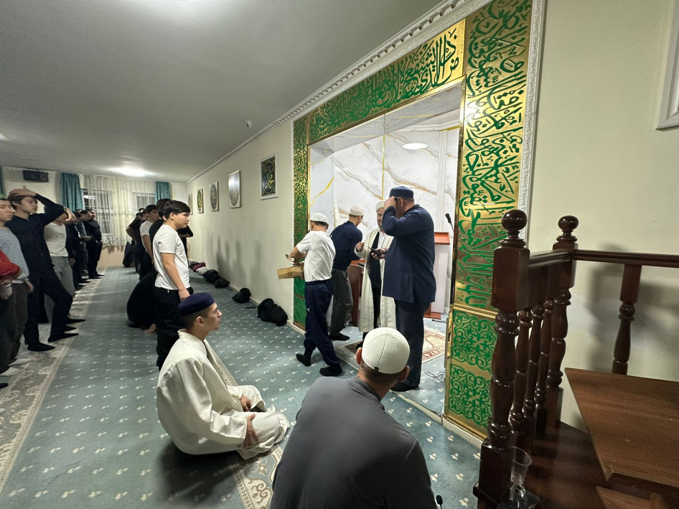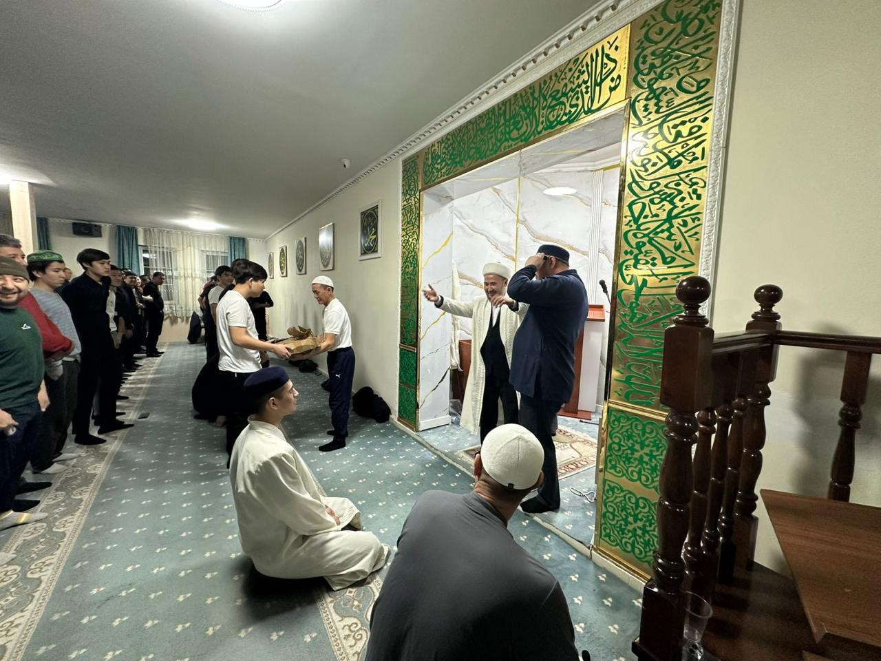 Кездесу соңында жамағатқа құрмет ретінде тәспі сыйлық етіліп, намазда сап түзеді.