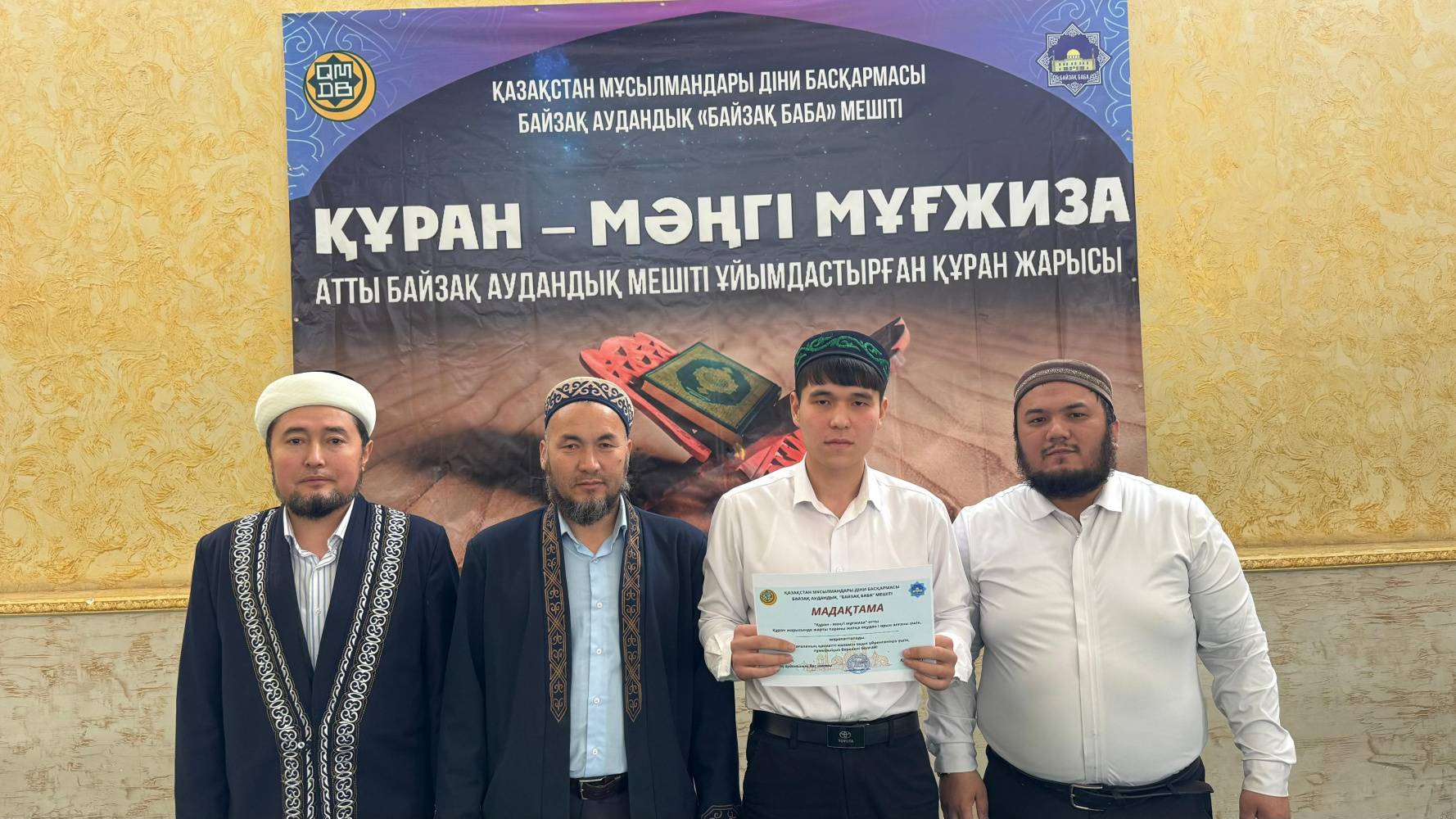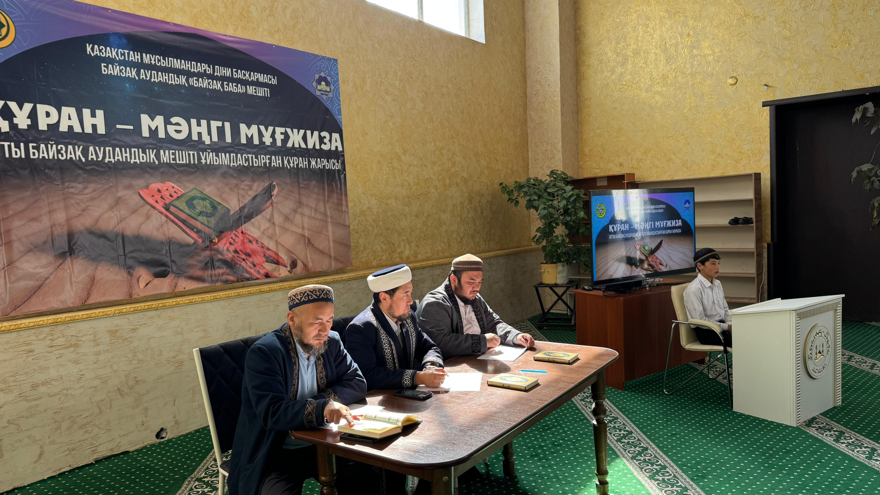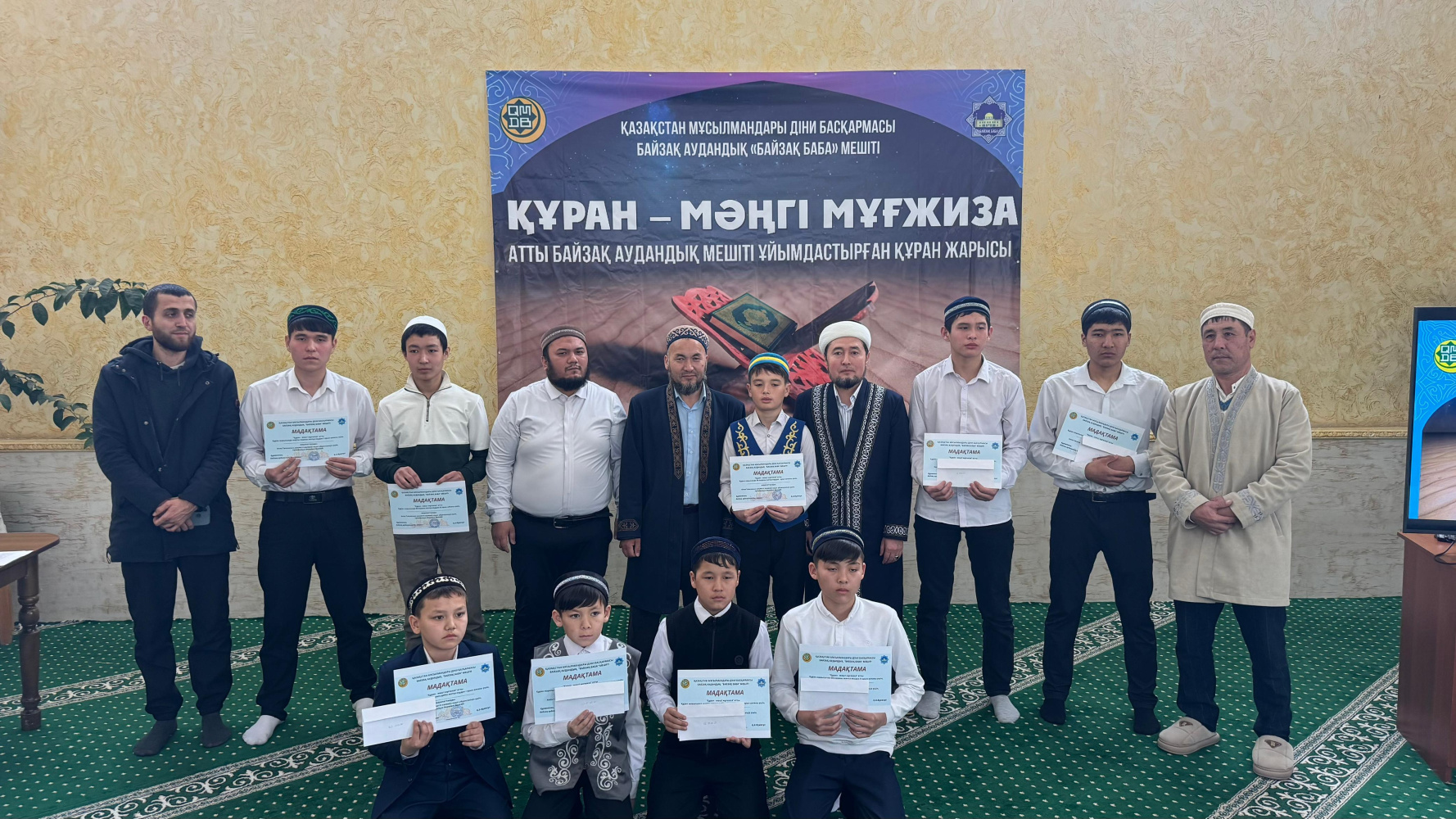 Байзақ аудандық орталық «Байзақ баба» мешітінің бас имамы Қанат Әділханұлының ұйымдастыруымен қасиетті Рамазан айында Қадір түнінің құрметіне «Құран мәңгі мұғжиза» атты аудандық Құран жарысы өтті. Аталған сайысқа мешіт шәкірттерінен 35 үміткер қатысып, Қасиетті Құранның 30-парасын, жарты параны және жарты параға дейін жатқа оқудан өзара бақ сынасты. Шараның басты мақсаты – жас буынды Рамазан айында Құран оқуға баулу, олардың діни білімін арттырып, Құранға деген сүйіспеншілігін шыңдау.