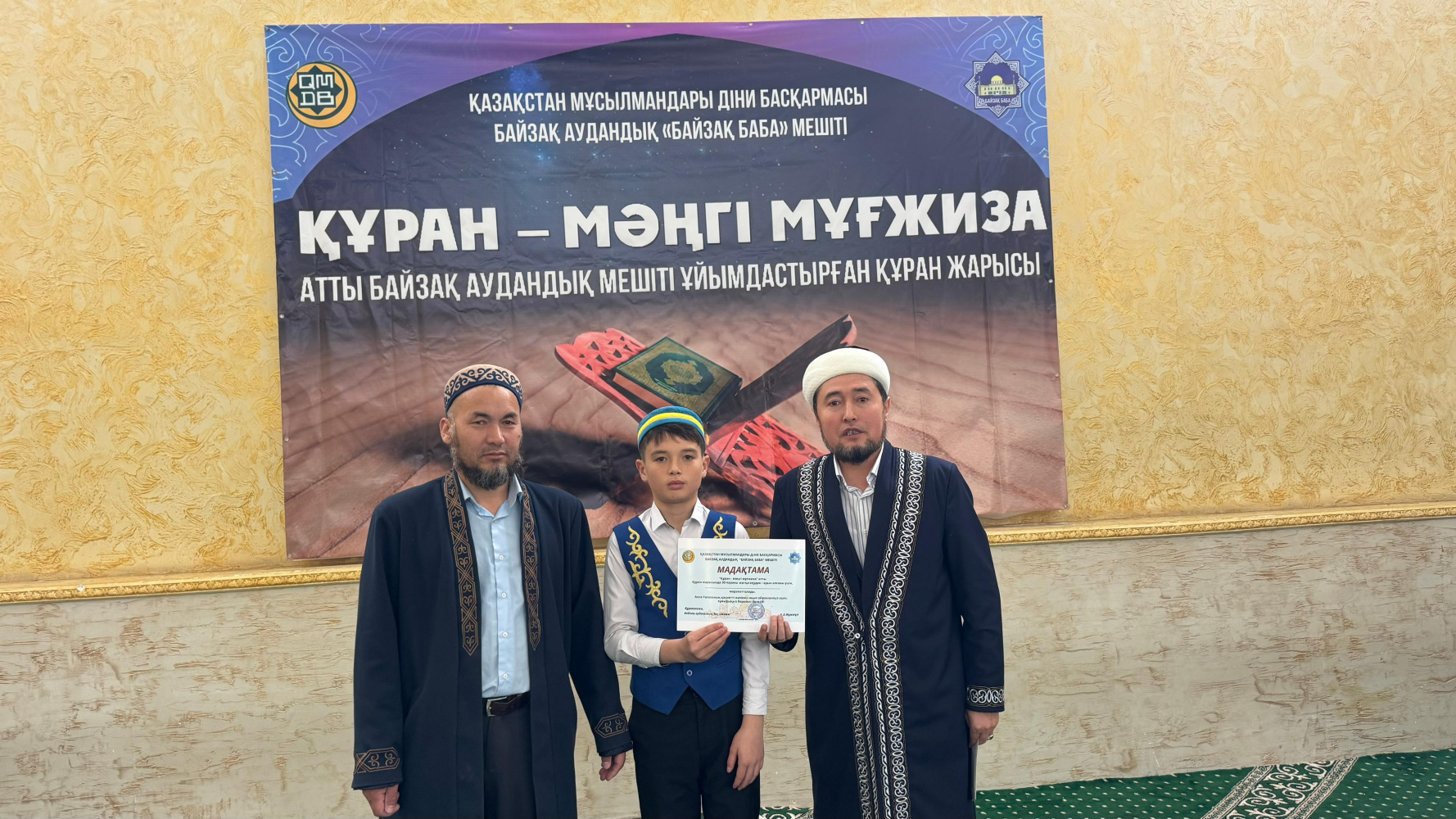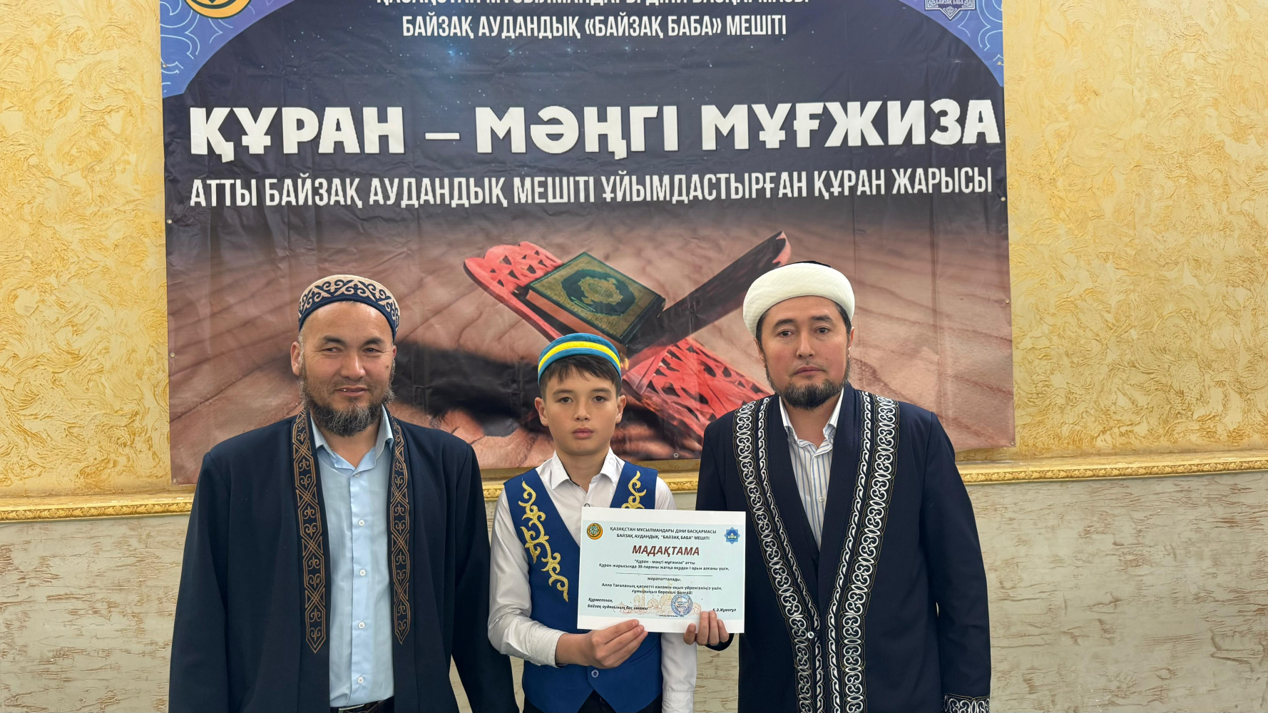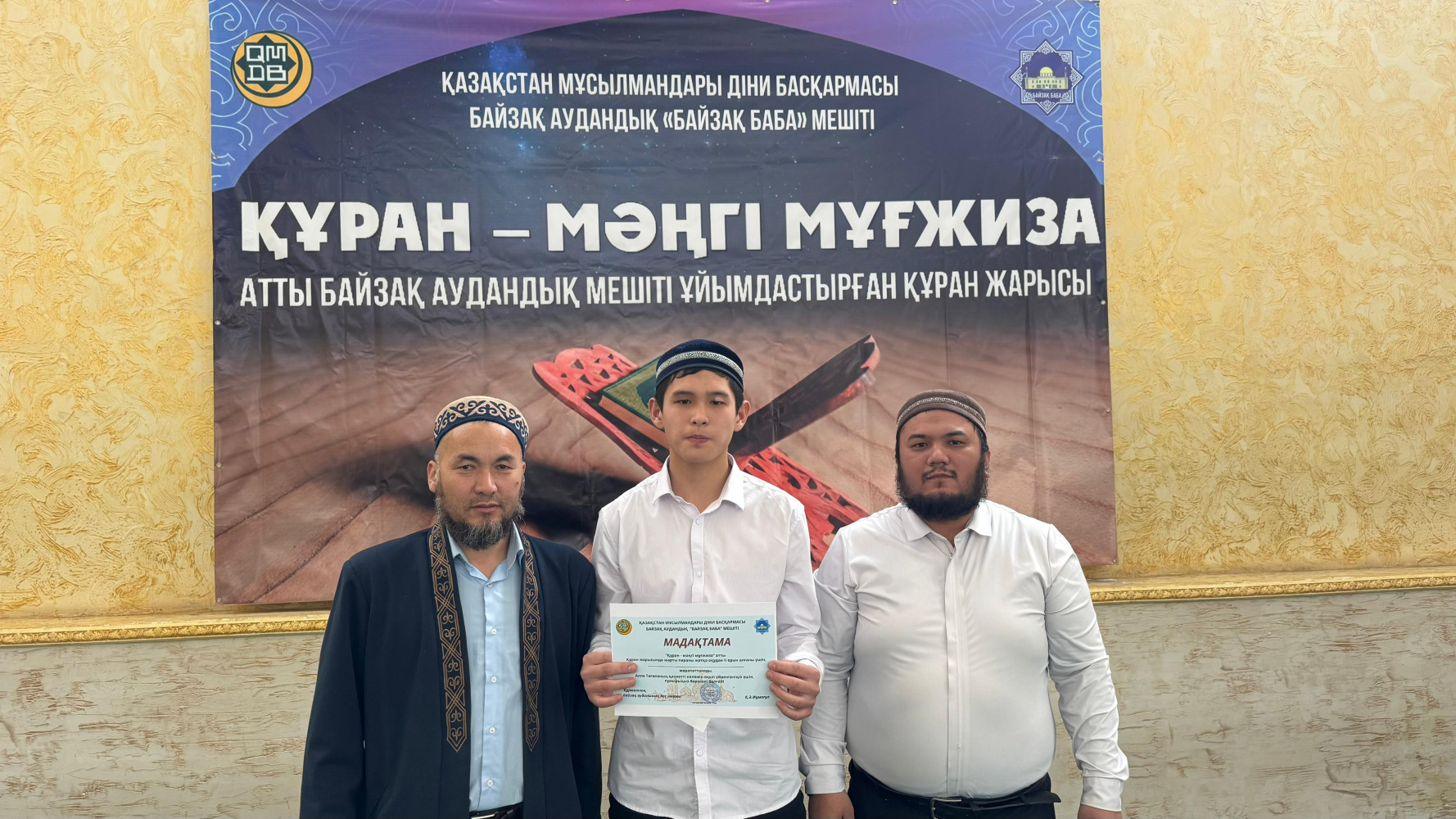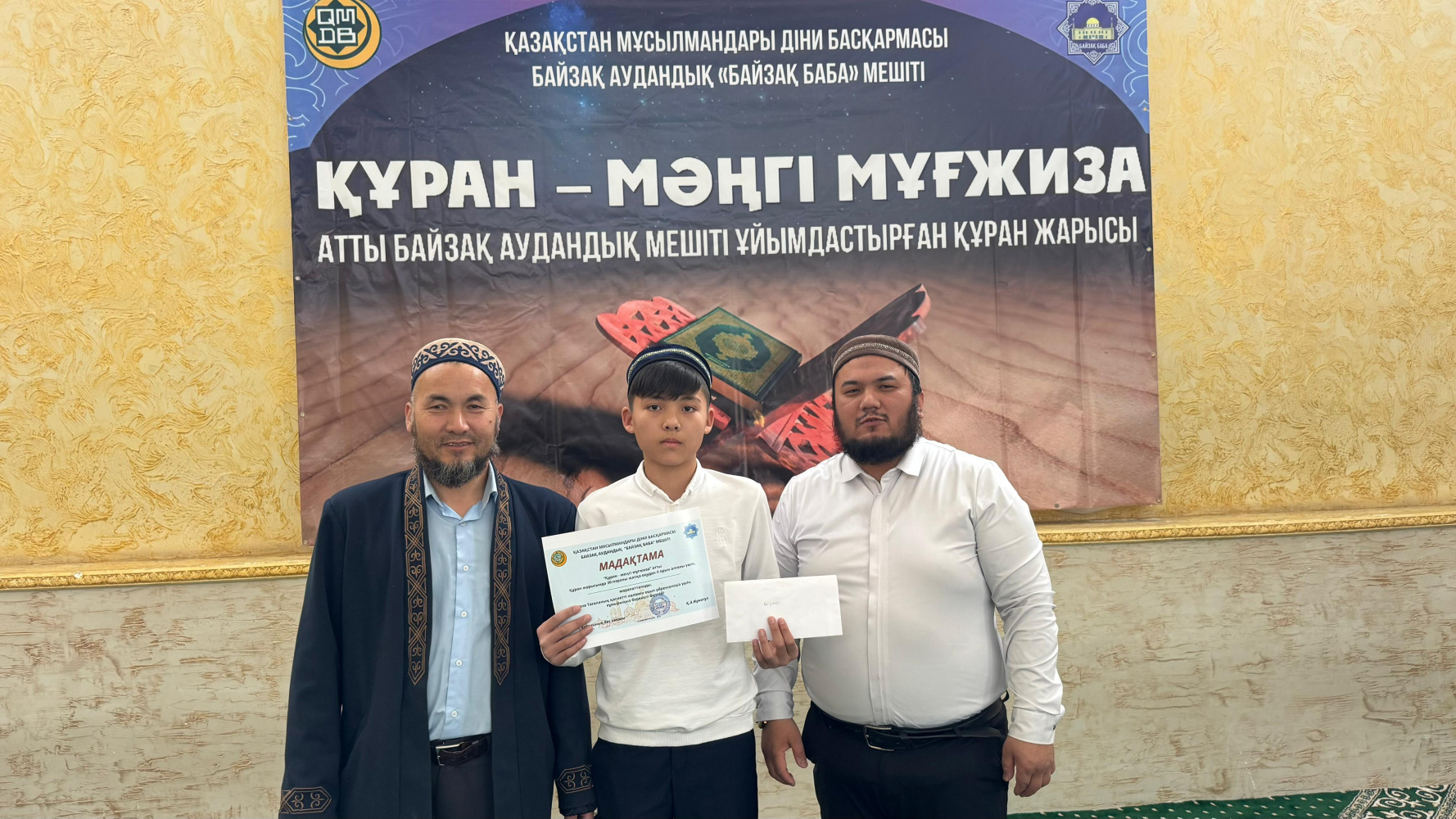 Байзақ аудандық орталық «Байзақ баба» мешітінің бас имамы Қанат Әділханұлының ұйымдастыруымен қасиетті Рамазан айында Қадір түнінің құрметіне «Құран мәңгі мұғжиза» атты аудандық Құран жарысы өтті. Аталған сайысқа мешіт шәкірттерінен 35 үміткер қатысып, Қасиетті Құранның 30-парасын, жарты параны және жарты параға дейін жатқа оқудан өзара бақ сынасты. Шараның басты мақсаты – жас буынды Рамазан айында Құран оқуға баулу, олардың діни білімін арттырып, Құранға деген сүйіспеншілігін шыңдау.