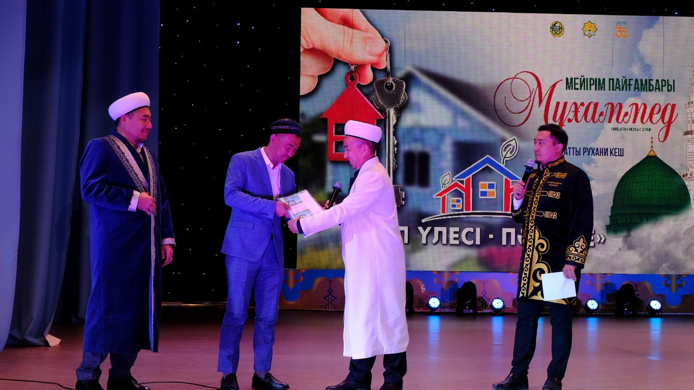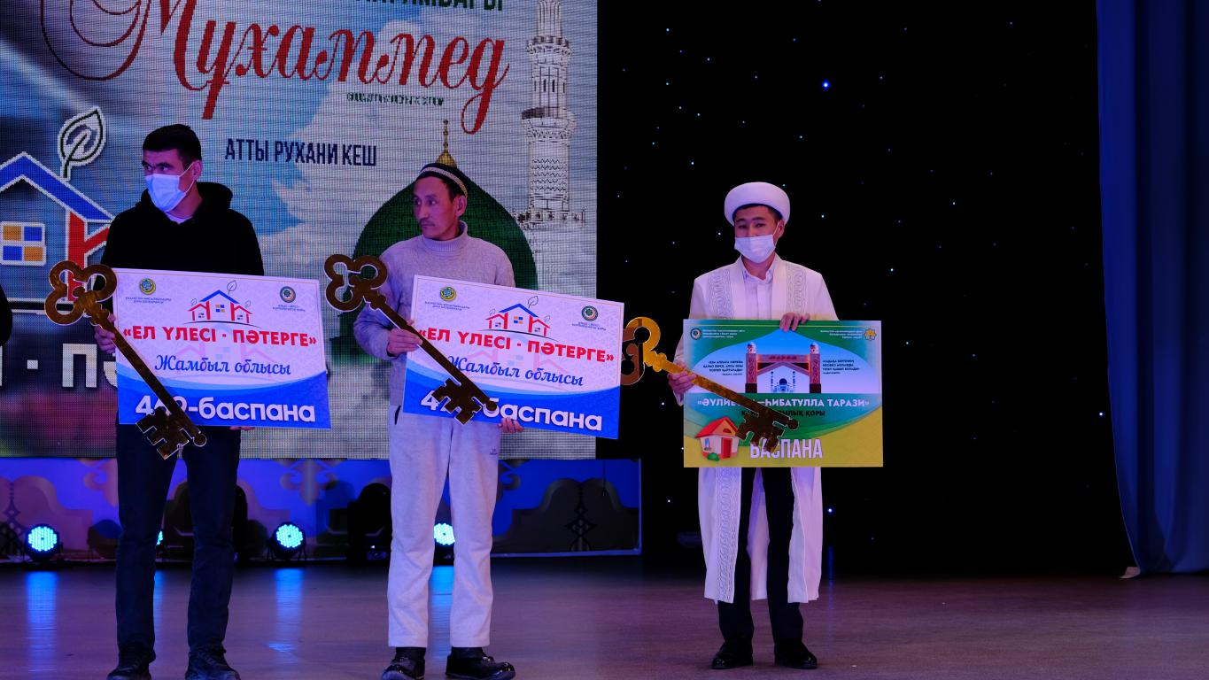 Көпшілік алдында 4 бірдей 469, 470, 471, 472-ші үйлердің кілтін табыстады. Тұрғын үй көпбалалы отбасылармен қатар Қордай ауданындағы ауылдық мешіттің жас маманына да берілді. Айта кетейік, үйге арналған қаражат аудан имамдарының, "Зекет" қорының, жаңа атаулы қордың мұрындық болуымен, демеушілердің және бүгінгі кештің билет қаржысына алынды. Облыс бас имамы көпшілікке алғыс білдіріп, Тараздың бас имамы қор туралы толық ақпарат беріп өтті.
