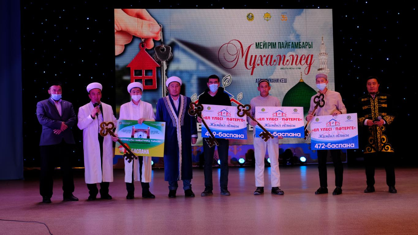 Сахнаға 469, 470, 471, 472-ші баспаның иелерін шақырып, кілтін табыстады. Айта кетейік үй "Зекет" қоры, аудан имамдарының мұрындық болуымен және демеушілердің қолдауымен, әрі Мәуліт кеші билетінің қаражаттарына алынды.