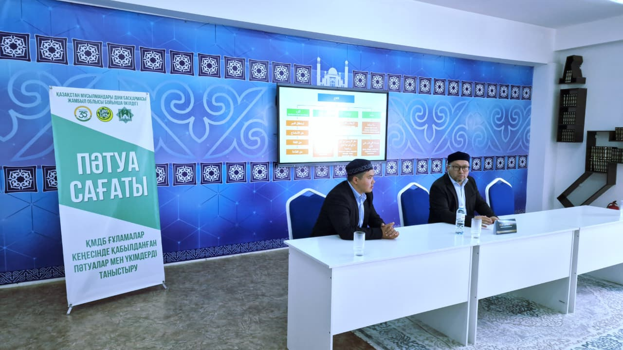 РАНТ мүшесі, ҚМДБ Пәтуа бөлімінің маманы Медет Құрмашұлы облыстық «Һибатулла Тарази» мешітінде Жамбыл өңірінің қала және аудан бойынша пәтуәға жауапты имамдарына арнайы семинар өткізді. Шараға Пәтуа бөлімінің Жамбыл облысындағы жауапты маманы Әбдіқадір Сейтқали қатысты.