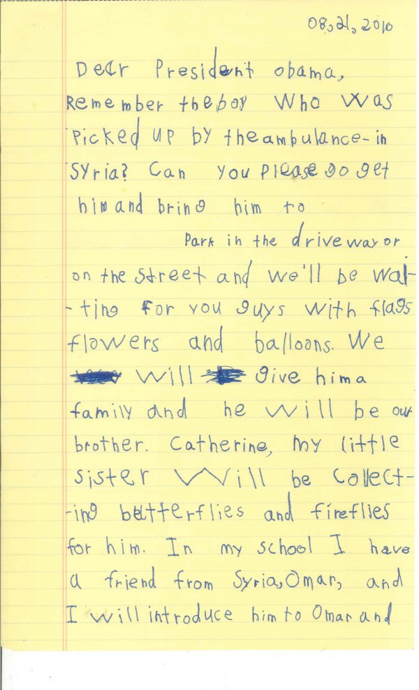 Бұл сурет АҚШ-тың 6 жасар баласын бей-жай қалдырмады. Алекс есімді бала Президент Барак Обамаға хат жазып, Сириялық балақайды өз отбасында әкелуін өтінген.